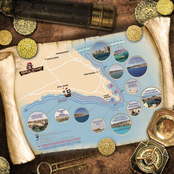 O 10:30 Czarna Perła wypływa z portu i rusza wzdłuż wybrzeża Ayia Napy. Na początku rejsu możesz na spokojnie nacieszyć się widokami, poczuć morską bryzę i wakacyjny klimat, zanim piracka zabawa rozkręci się na dobre.
